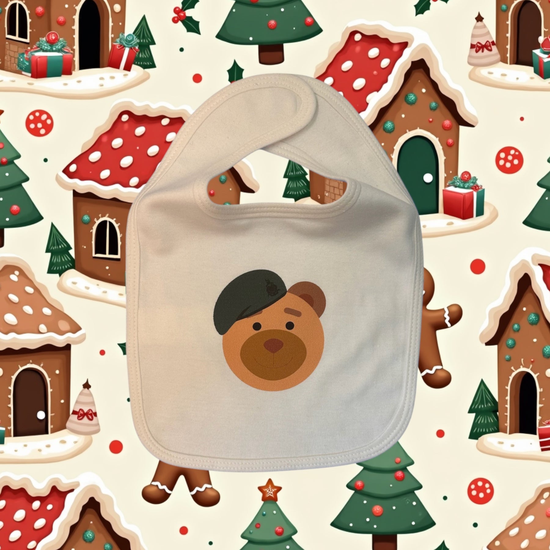 White baby bib featuring our RM Booty Bear