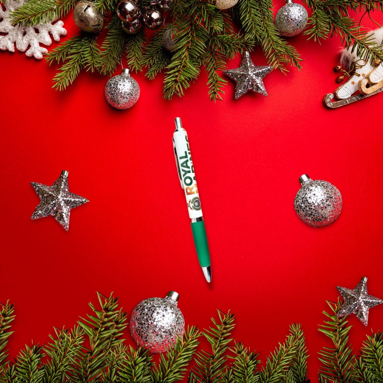 Click top, ball-point black ink pen, with green grip and RMA-The Royal Marines Charity logo.