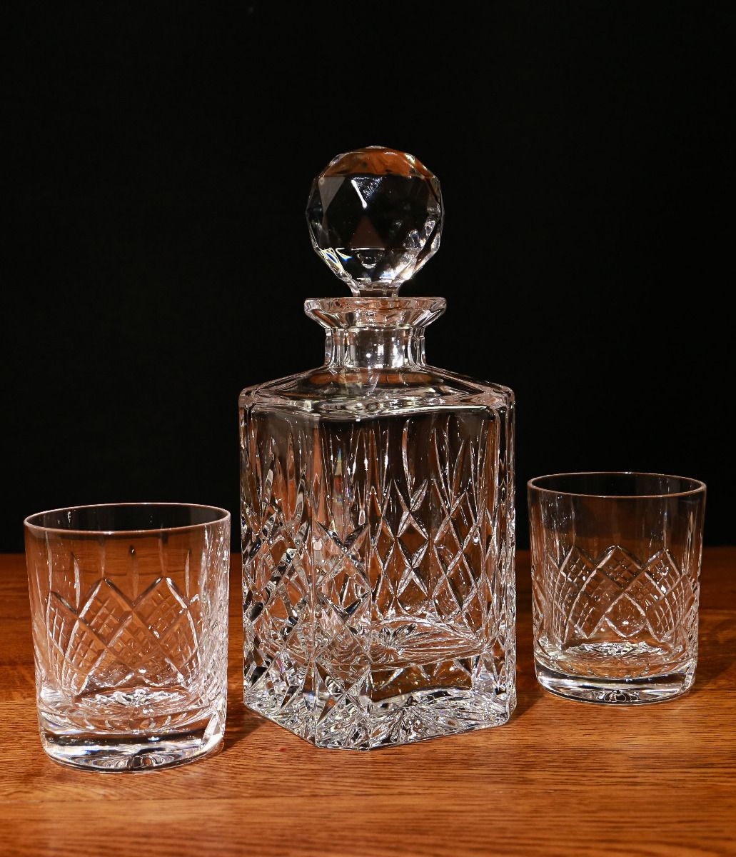 Store and enjoy your favourite tipple in style with this set of Crystal Whisky decanter and two glasses. The clarity of the crystal with cutting catches the light to shine in a way that glass can never match.