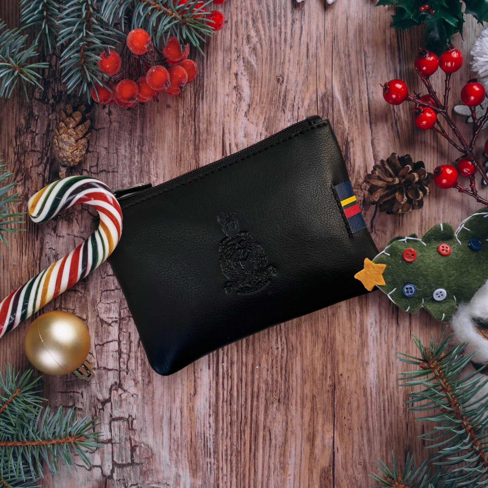 Black high grade, hand made fine leather coin purse embossed with a Globe & Laurel.