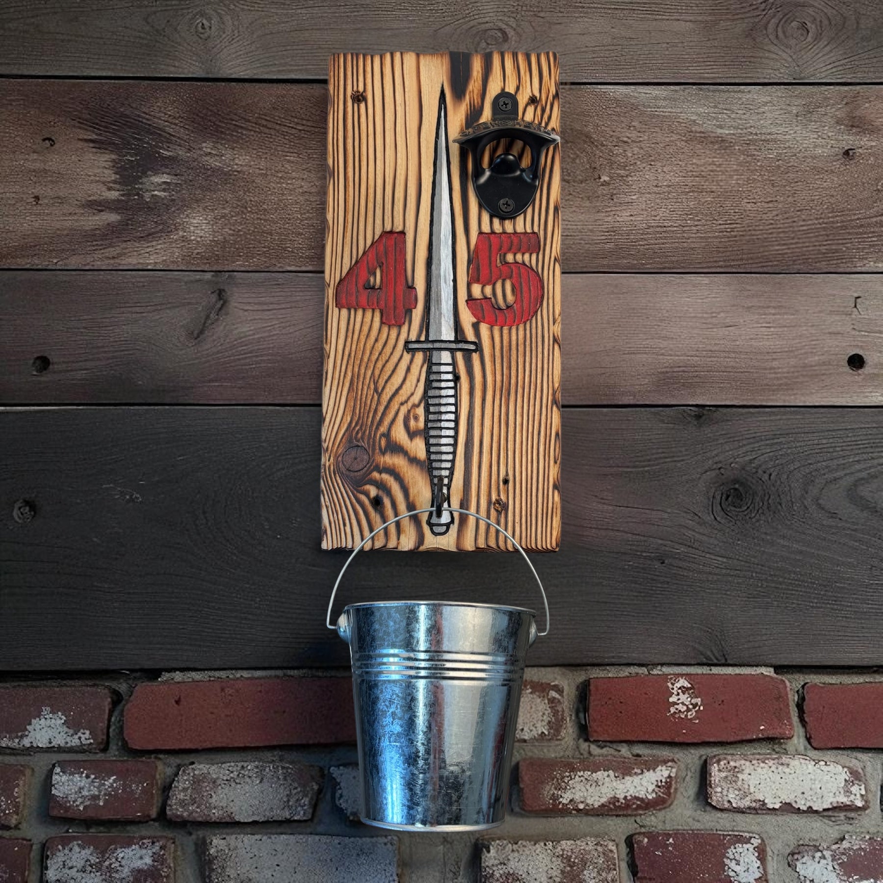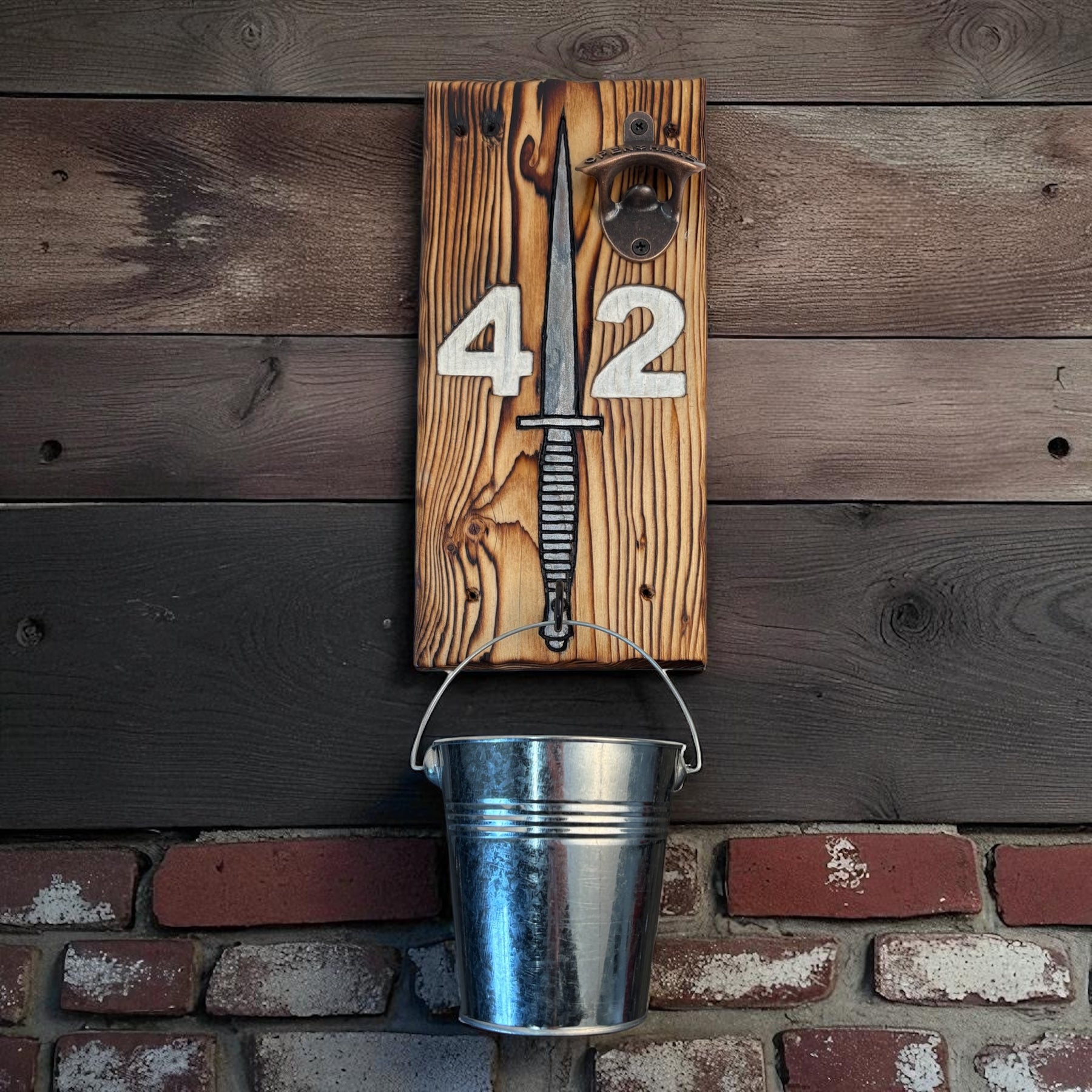 These fantastic wall mounted bottle openers are a great addition to any home or bar. Handmade and hand engraved to order, the bottle openers are made from upcycled and reclaimed wood and finished in a high Quality Osmo UV protection oil. Includes a stainless steel bucket for bottle caps.