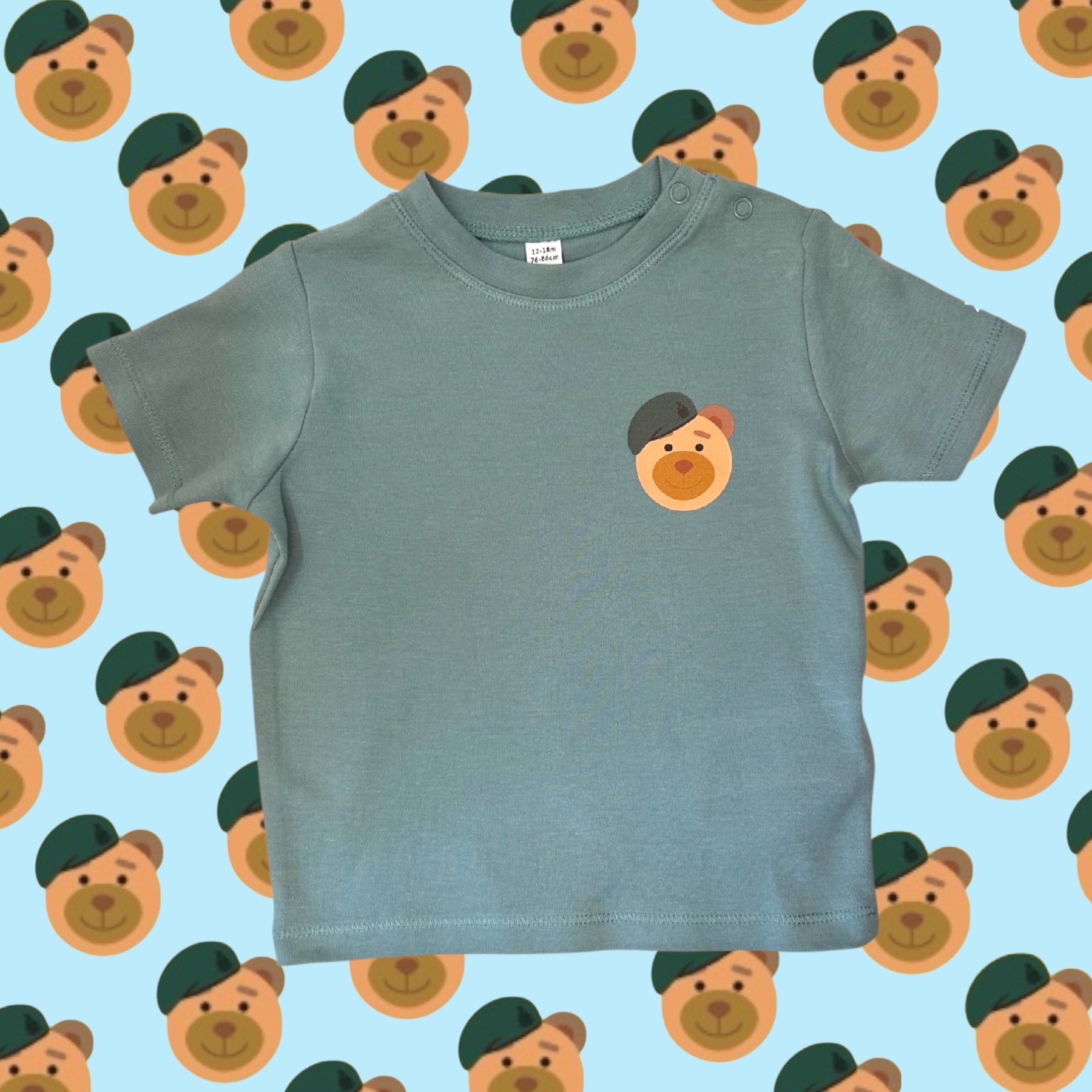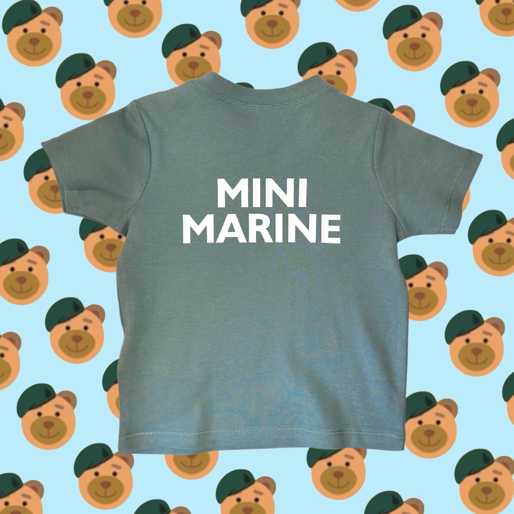 Cute baby/toddler sage green t-shirt featuring our RM Booty Bear print to the left chest and printed Mini Marine on the back.