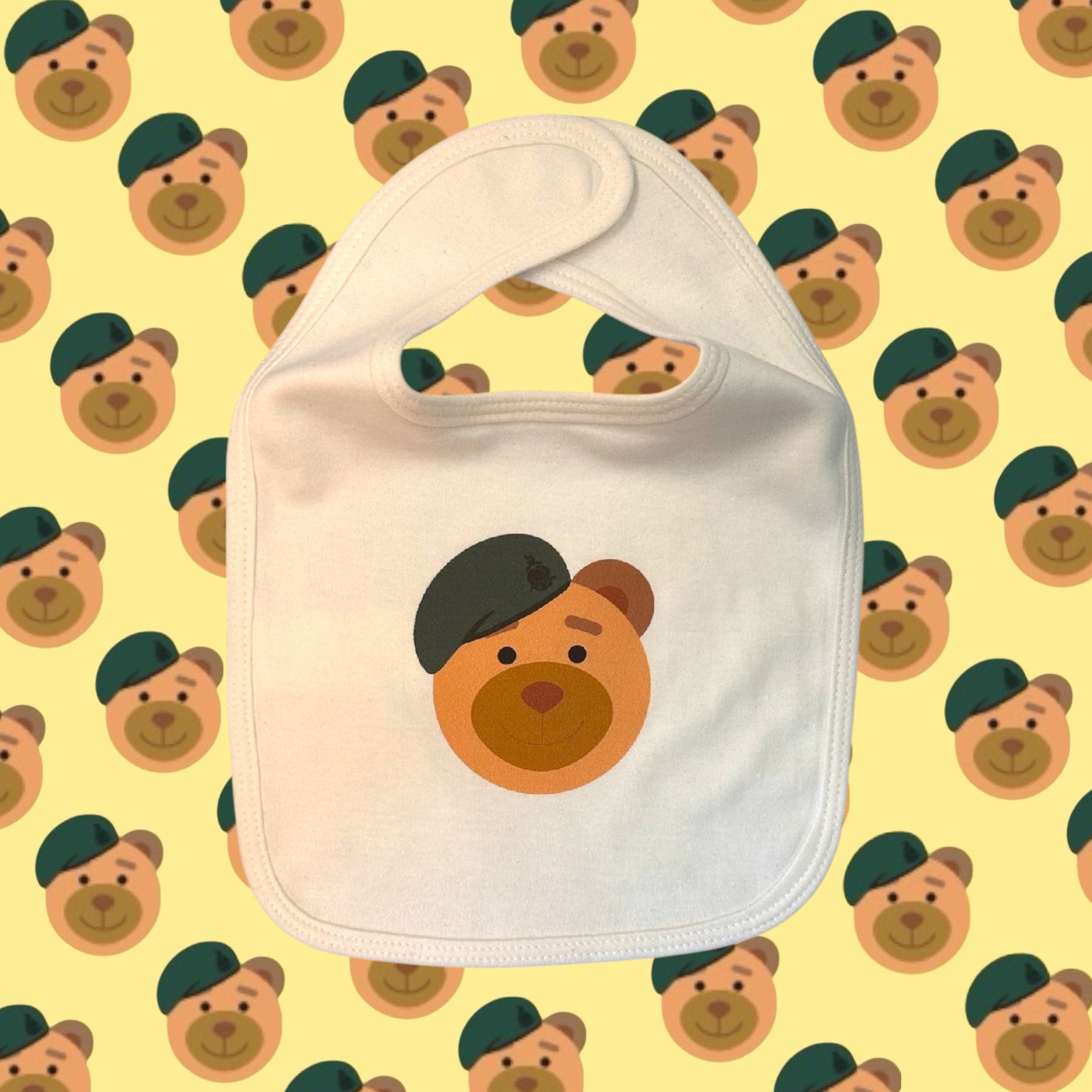 White baby bib featuring our RM Booty Bear