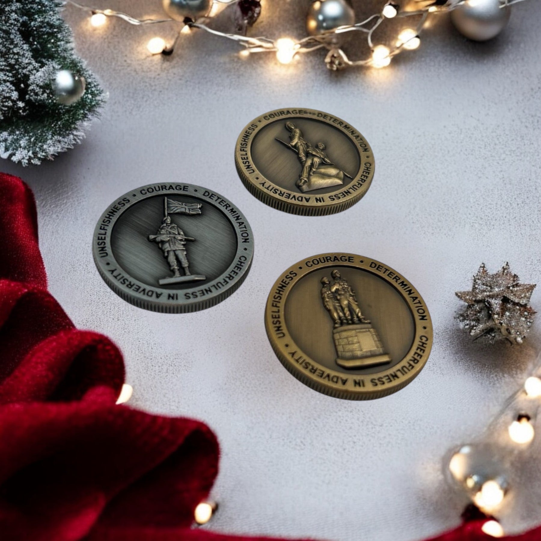 A complete set of three Royal Marines spoof coins with the globe and laurel on the front with the wording Royal Marines Commando. On the rear is the 3 statues of the Royal Marines: Spean Bridge, the Falklands Yomper and the Graspan Royal Marines memorial. The commando values  are around the rim. The coins then come conveniently packaged in a drawstring commando green pouch. A must set for all Royal Marines.